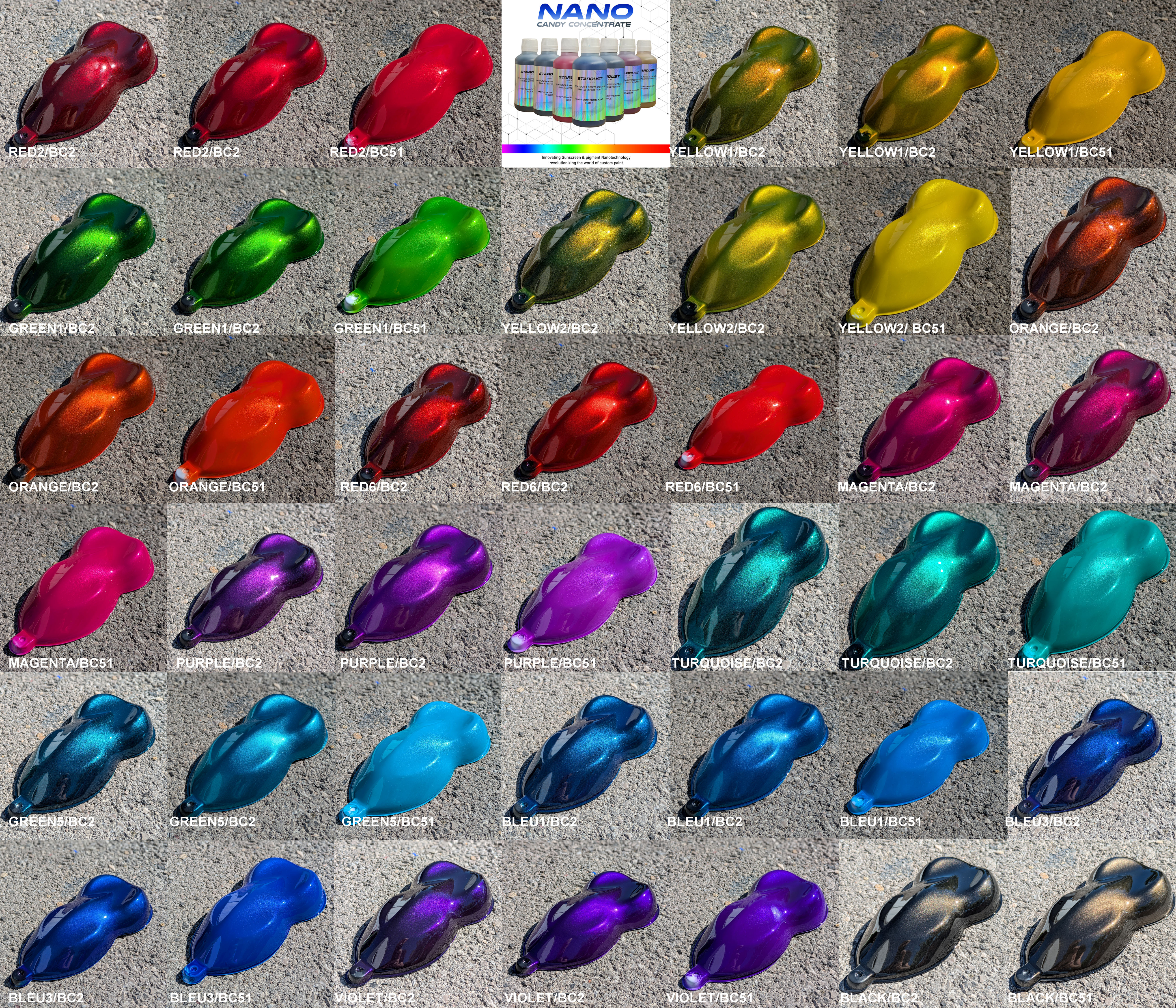De kleuren die worden verkregen in een Candy-systeem (basis + transparante Candy-kleur) zijn het resultaat van de combinatie van de ondergrond en het aantal aangebrachte Candy-lagen.
